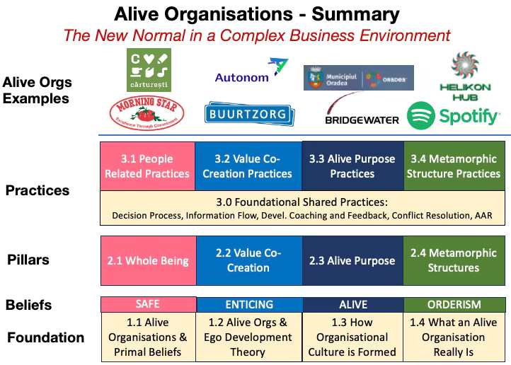 The four areas are interdependent and influence each other. It’s organisation (and leaders of the organisation) choice if the destination is a Mechanistic Organisation or an Alive Organisation.
