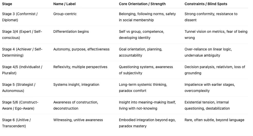 Here is a high-level overview of the stages from conventional to postconventional (as per Cook-Greuter) — useful to map how leaders / systems differ in their interpretive capacities.