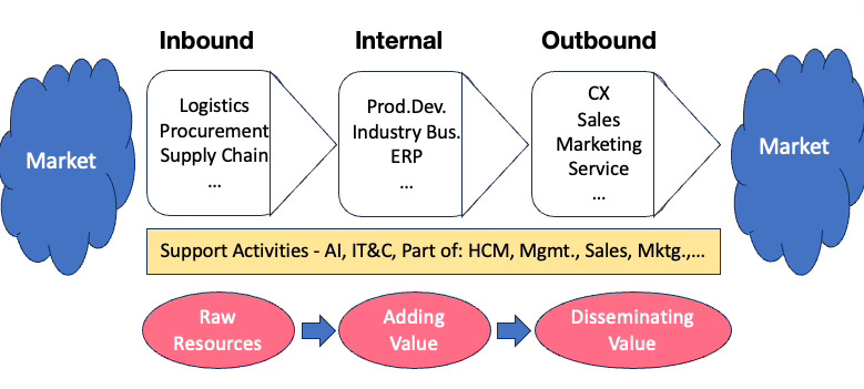 Traditional business describes a value chain: inbound → internal → outbound.