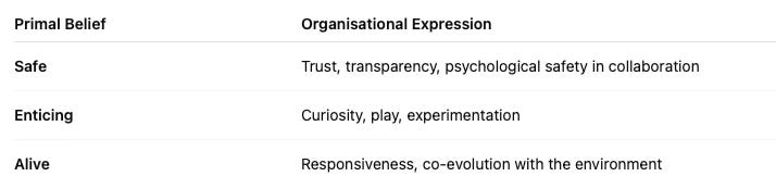 The primal beliefs explored earlier — Safe, Enticing, Alive — manifest here as three types of organisational energy:
