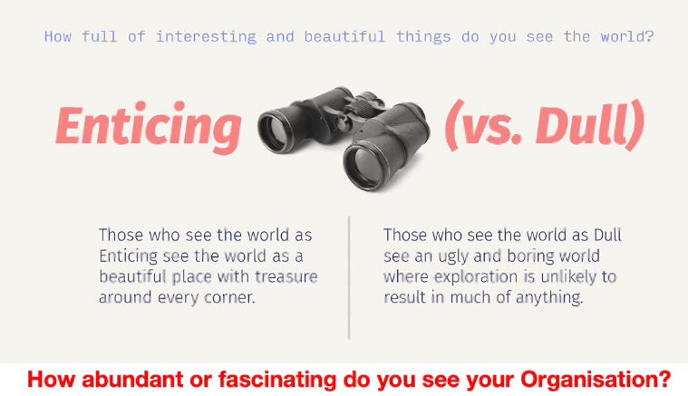 The opposite of a dull organisation is not merely an entertaining one; it is an enticing one — a system that stimulates curiosity and wonder. In an enticing organisation, people experience work as discovery. The atmosphere invites exploration, not exhaustion.