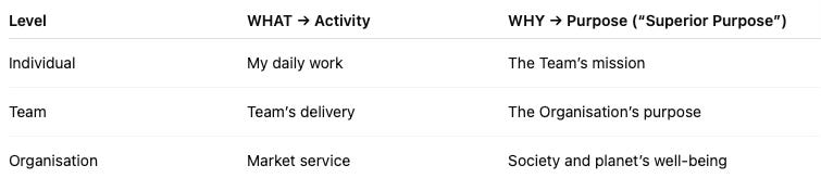 In an Alive Organisation, each level’s why becomes the what of the next. This creates a fractal purpose architecture: purpose flows upward as meaning and downward as strategy.