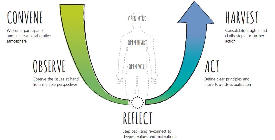 This is where the practice of Presencing enters, inspired by Otto Scharmer’s Theory U.